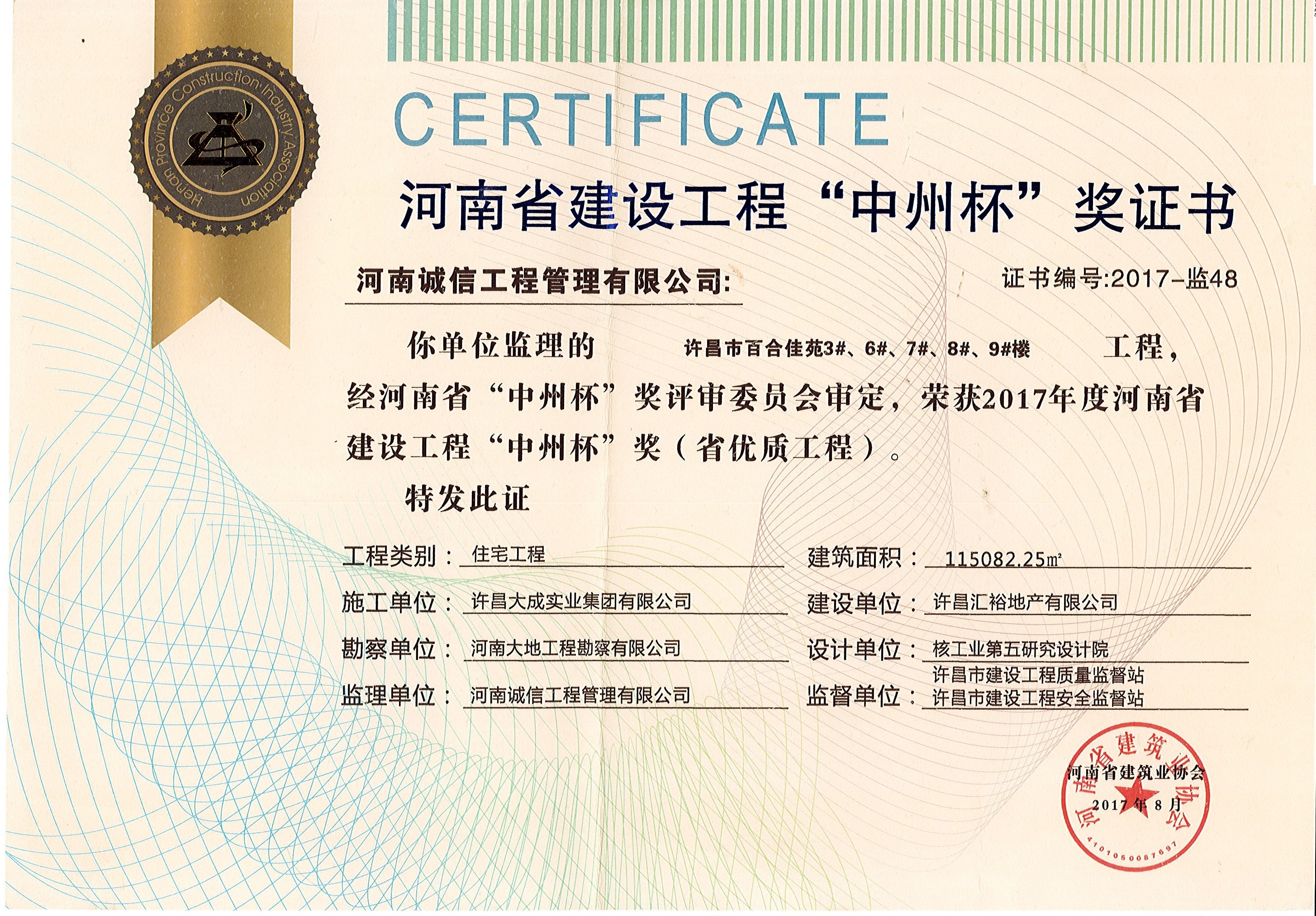 許昌市百合佳苑榮獲2017年度河南省建設(shè)工程“中洲杯”獎(jiǎng)(省優(yōu)質(zhì)工程)