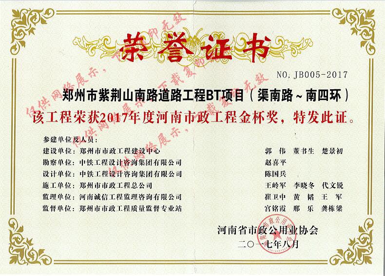 2017年度河南市政工程金杯獎(jiǎng)鄭州市紫荊山南路道路工程BT項(xiàng)目(宇通路~環(huán)翠路)