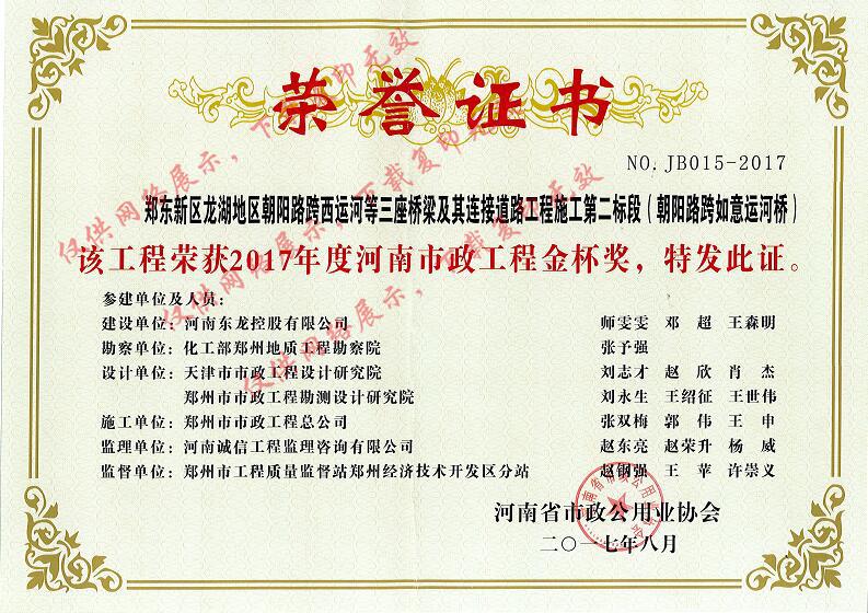 2017年度河南市政工程金杯獎(jiǎng)鄭東新區(qū)朝陽路跨如意運(yùn)河橋