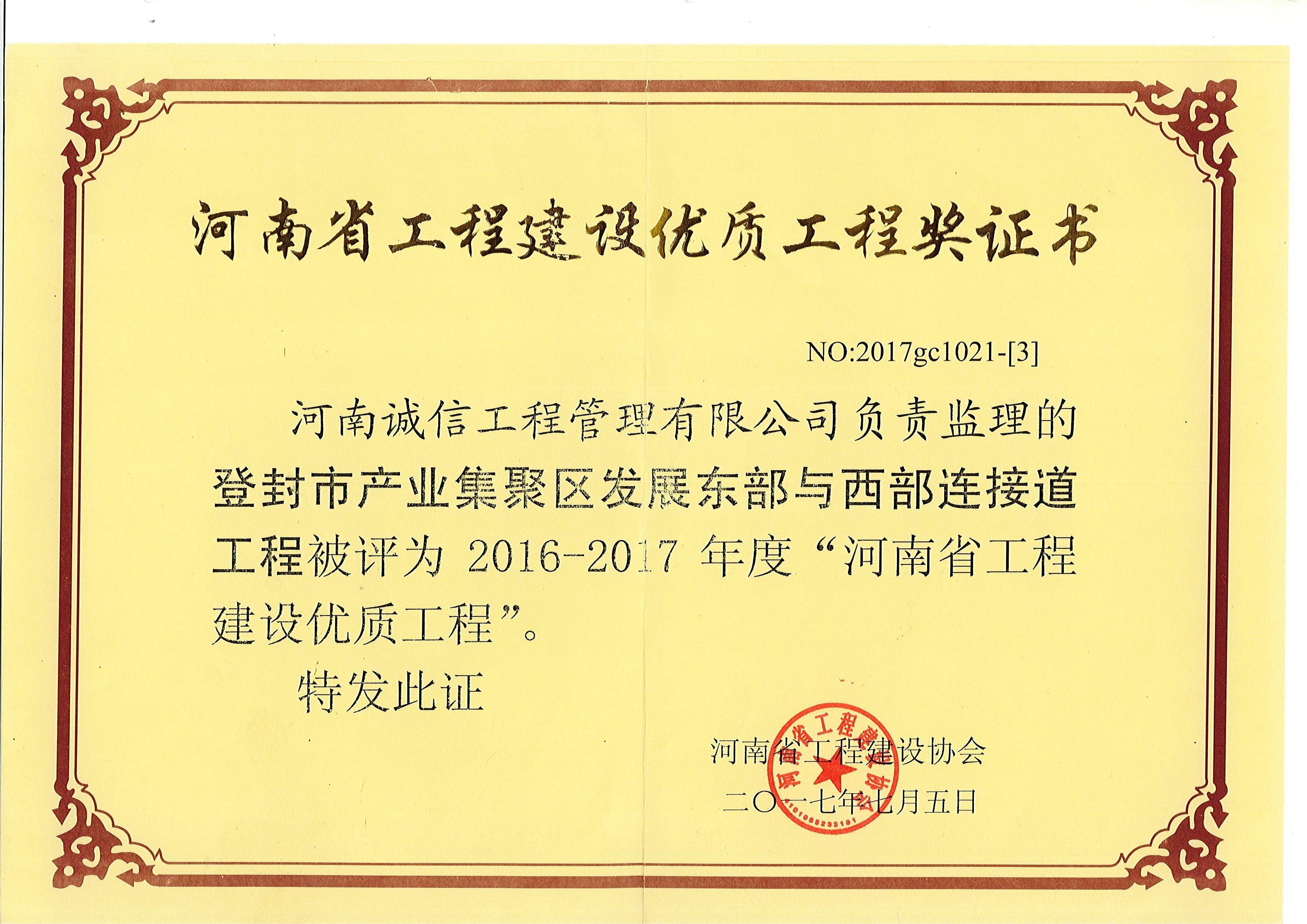 登封市產(chǎn)業(yè)集聚發(fā)展東部與西部連接道工程榮獲2016-2017“河南省工程建設(shè)優(yōu)質(zhì)工程”