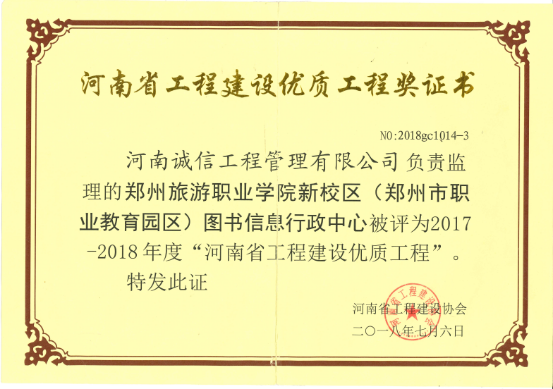 鄭州市旅游職業(yè)學(xué)院新校區(qū)圖書信息行政中心別評(píng)為2017-2018年度“河南省工程建設(shè)優(yōu)質(zhì)工程”