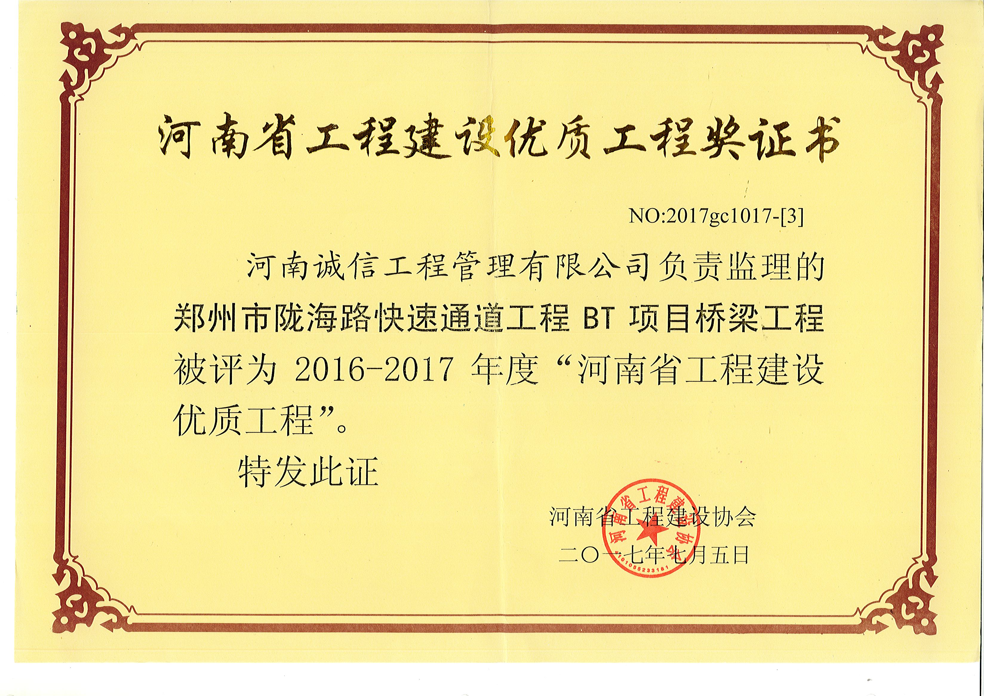 鄭州隴海路快速通道工程BT項(xiàng)目橋梁工程“榮獲2016-2017河南省工程建設(shè)優(yōu)質(zhì)工程”